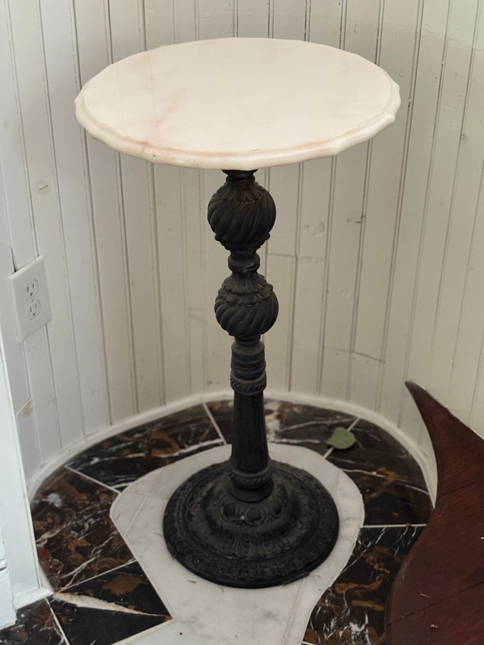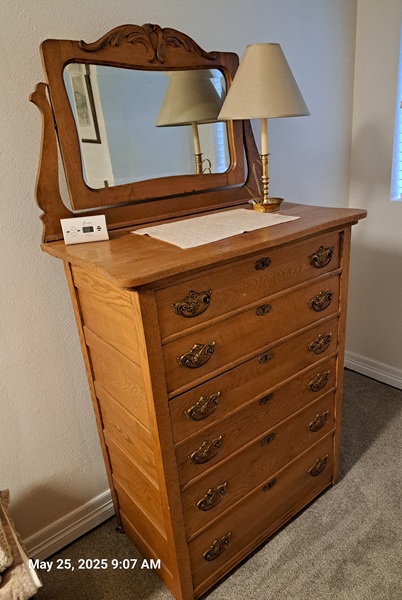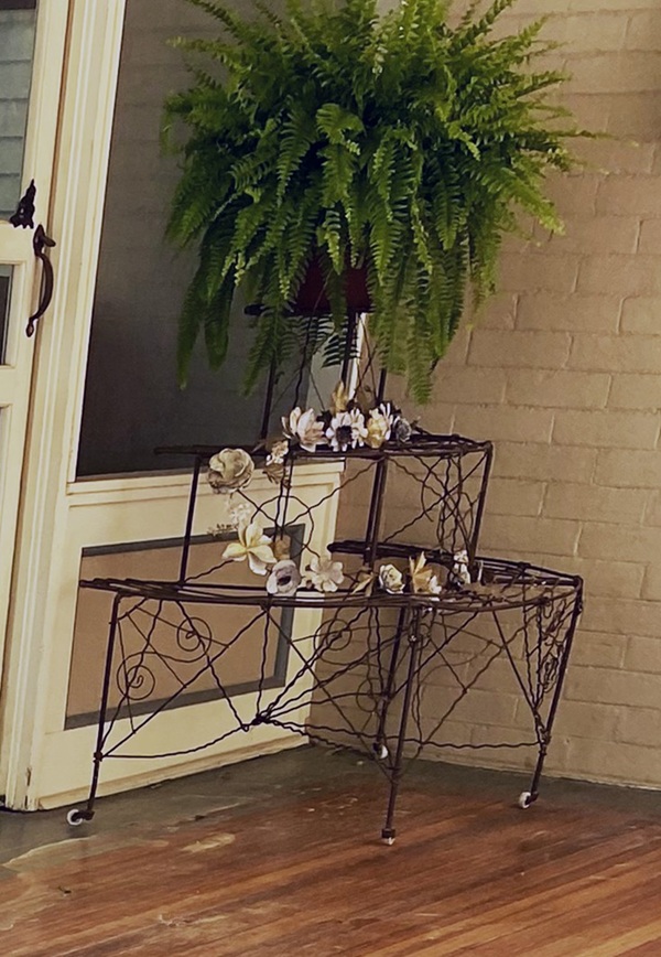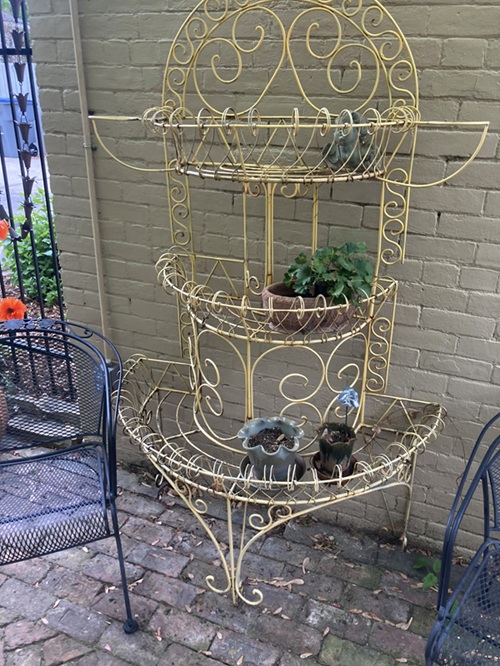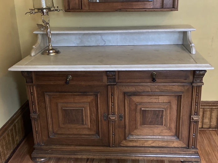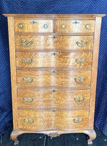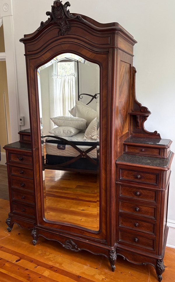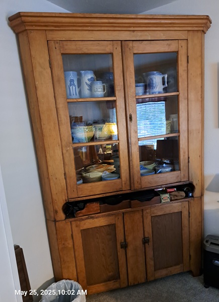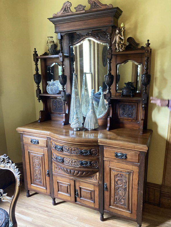 Double door oak bookcase with leaded glass; oak dental cabinet; unusual ¼ sawn oak ladies “S” roll-top desk w/raised panels; oak hall tree; circa 1880’s gold gilded pier mirror w/marble base; carved high-back triple mirrored sideboard; “Larkin” triple curved glass claw-footed china cabinet; rare oak lingerie chest w/claw feet; fully carved oak drop front desk; ½ size oak stacking bookcase w/leaded glass; 5 section stacking lawyer’s bookcase; oak Hoosier kitchen cabinet; pine pie safe; oak drop front secretary bookcase; fancy high-back walnut Eastlake bed; early mahogany Empire sewing stand; high quality carved mahogany dresser w/beveled mirror; rare 1860’s walnut linen press; small oak corner curio cabinet; marble top walnut server; great selection of mirrored dressers and highboy chests; oval marble top walnut pedestal library table; mission oak library tables; 1930’s mohair living room chairs; cow hide bench; fancy iron & brass beds; great selection of fancy lamp and parlor tables; cedar and blanket chests; wrought iron baker’s rack; park bench; oak photographers chair; early pine cupboard; washstands; set of (6) carved walnut needle point chairs; other dining chairs and tables; metal garden bench and planters;