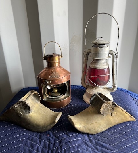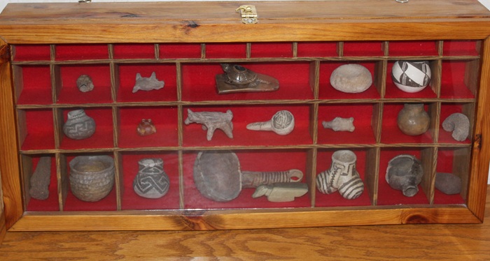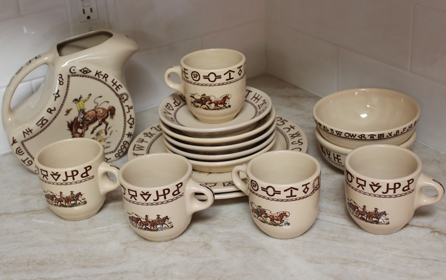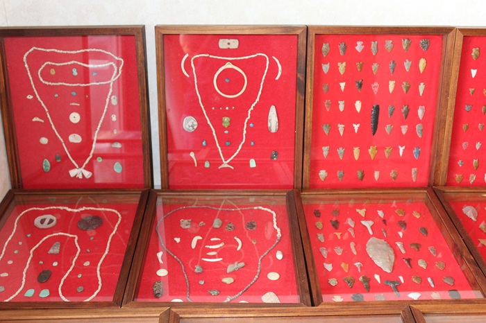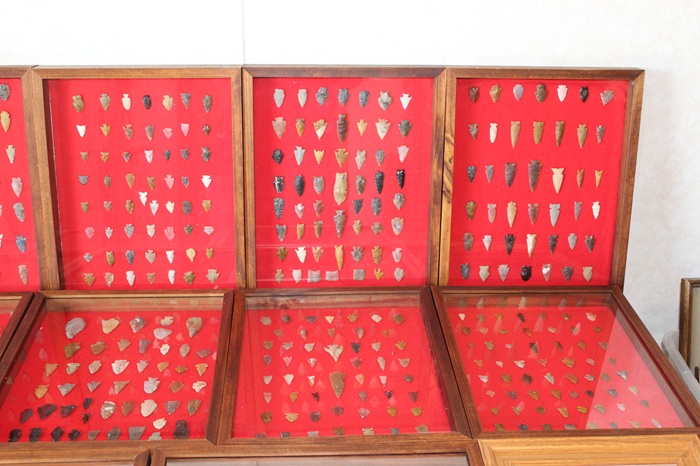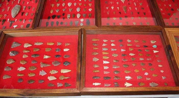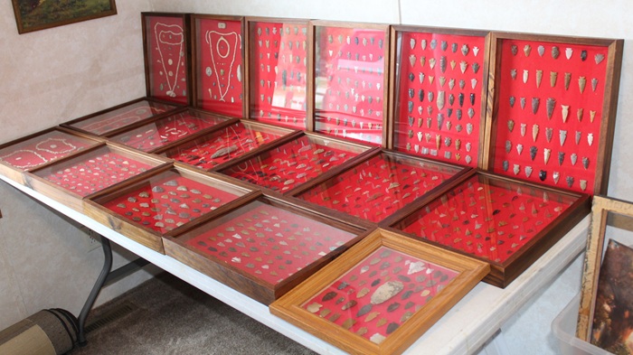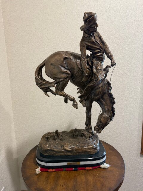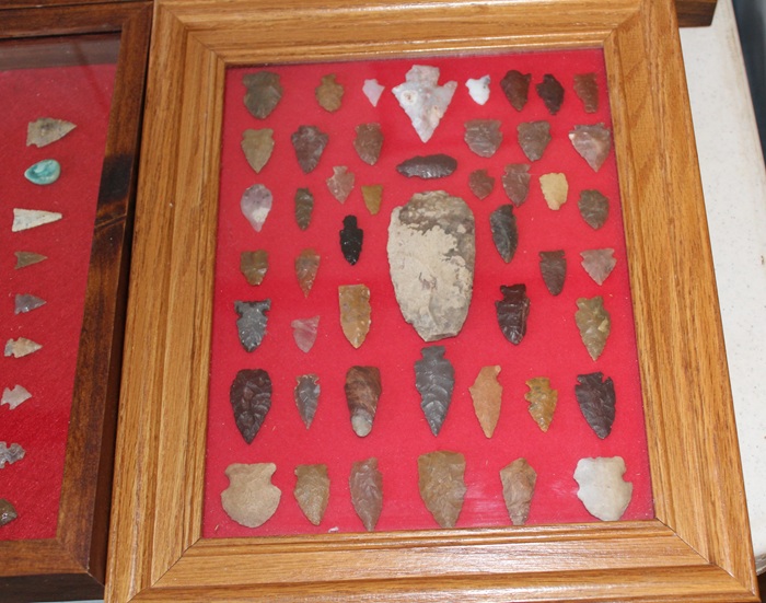 COLLECTIBLES, ART, POINTS: Wonderful collection of Colorado found arrowhead, points, and beads; several Navajo rugs; sterling silver flatware and serving pieces; old post card albums; ephemera; early books; costume jewelry; several pieces of good vintage clothing; military uniform; several double sided porcelain advertising signs; original framed art; western art; bronzes; antique and vintage beer trays; rare circa 1900 mechanical porcelain doll; ivory & marble carved figurines; W.R.A.C. 10ga. signal cast iron canon; hat pins; Seth Thomas banjo clock; mission style leaded glass table lamp; early floor lamps; antique radios & speakers; collection of Harley Davidson leather riding garments; antique fishing reels; wonderful stoneware & crockery; butter churns & primitive kitchen collectibles; cast iron & tin toys; “Wallace” cowboy china dishes; oil lamps and lanterns; art glass & pottery; antique tools;