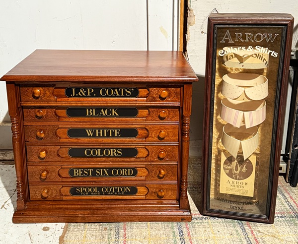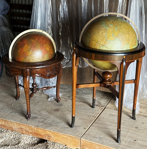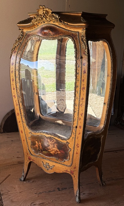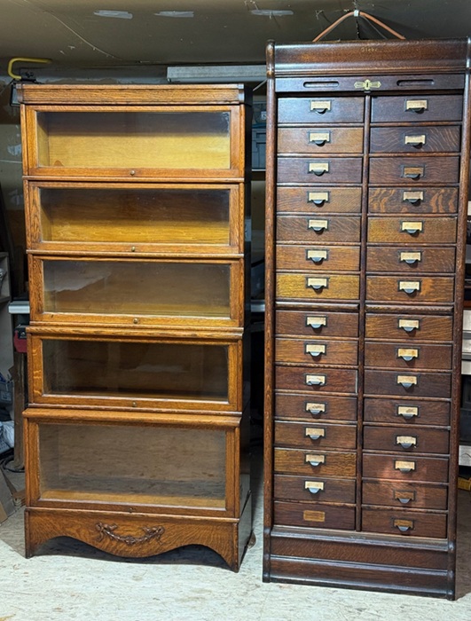 Very nice small size triple curved glass oak china cabinet w/claw-feet and carved lion’s heads; unusual oak lift seat hall tree w/diamond shaped mirror; circa 1880’heavily carved unusual drop front desk w/beveled mirrors; fancy high-back oak sideboard w/beveled mirror and Bombay sides; French marble-top side cabinet w/marquetry inlay; several lawyer’s stacking bookcases; double door oak bookcase w/leaded glass; French vitrine display cabinet w/bombay curved glass; 30 drawer oak letter filing cabinet; walnut spool cabinet; matching pr. of oak church pews; “Arrow” collar display case; 1880’s carved oak high-back bed; 1/4 “White Mountain” brand oak ice box; oak server w/carved cherubs; fancy oak sq. dining table w/carved legs; oval carved top oak library table with claw feet; mirrored oak highboy chest w/hat-box & serpentine drawers; oak Hoosier kitchen cabinet; very nice oak Grandfather clock; oak dropfront secretarty cabinets; Eastlake spoon carved settee; good selection of mirrored dressers and highboy chests; variety of lamp and parlor tables; mahogany music cabinet; pine harvest table; country pine cupboard; carved oak platform rocker; world globes w/wooden holders; washstands and commodes; MCM live edge coffee table; 1980’s chrome and vinyl dinette w/swivel chairs in mint condition; mission oak library table; mission oak one drawer stand; mission oak drop front desk; fancy treadle sewing machine; needle point slipper bench w/lift seat; round oak dining table; several sets of dining chairs; cedar chests & trunks; 2pc. settee & chair set made from horseshoes; lg. wall mirror from the “Broadmoor Hotel” selection of vintage table and floor lamps; wooden bolt bin;